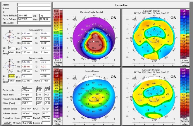 Al analizar las topografías se percibe una astigmatismo irregular en forma de cromosoma.