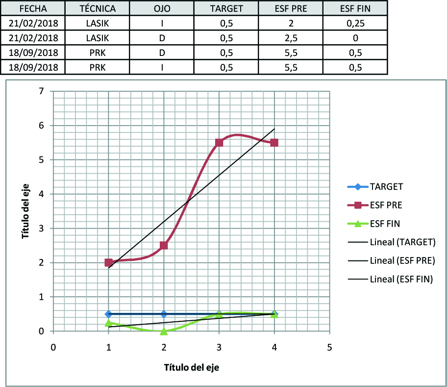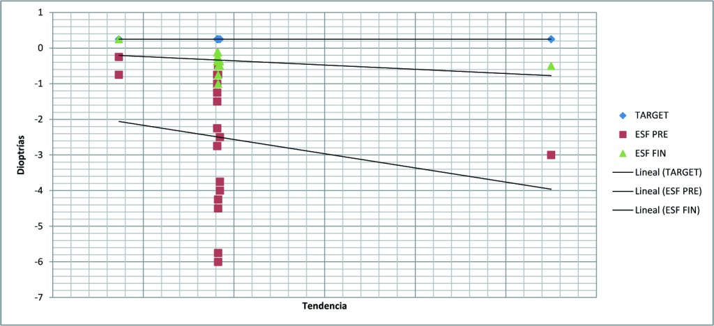 La primera línea es el target, la segunda línea es la tendencia postoperatoria y la tercera línea es la tendencia preoperatoria. Y en este caso obtenemos que se están produciendo hipocorrecciones y que cuanta mayor es la graduación que hemos trabajado mayor es la hipocorrección que se ha producido en las esferas.