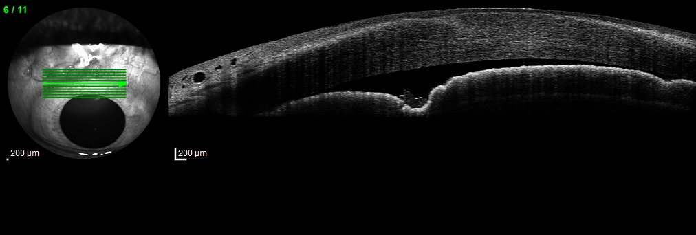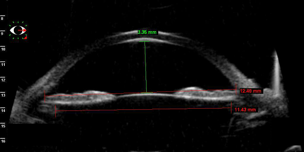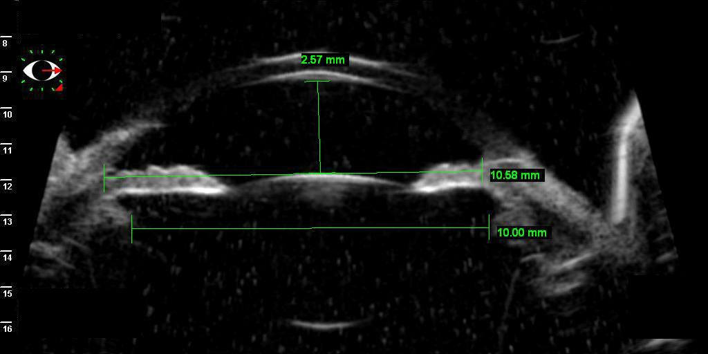Y por último las BMUs previas y en estado de hipotonía, donde se puede apreciar perfectamente un cambio en las medidas de todos los parámetros registrados: cámara anterior, distancia ángulo-ángulo y distancia cuerpo ciliar-cuerpo ciliar. Debido a los cambios producidos en las curvaturas corneales por las cirugías y por el cambio de medidas en las estructuras internas, se registró una disminución aproximada de 1.5 dp en la refracción (hipermetropización) del preoperatorio al postoperatorio.