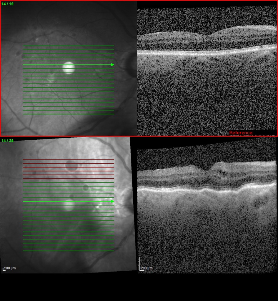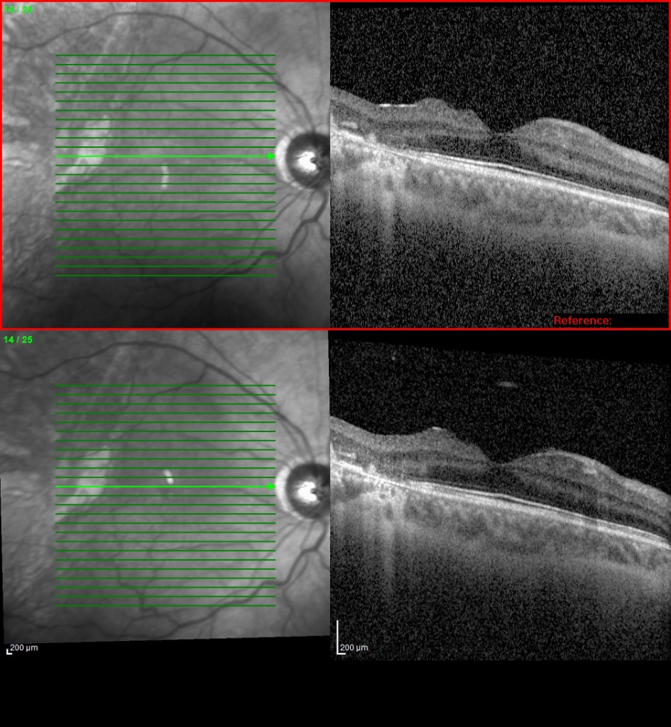 Las OCTs previas y en hipotonía, con un registro claro de los pliegues maculares, con la consiguiente pérdida de calidad en la visión: